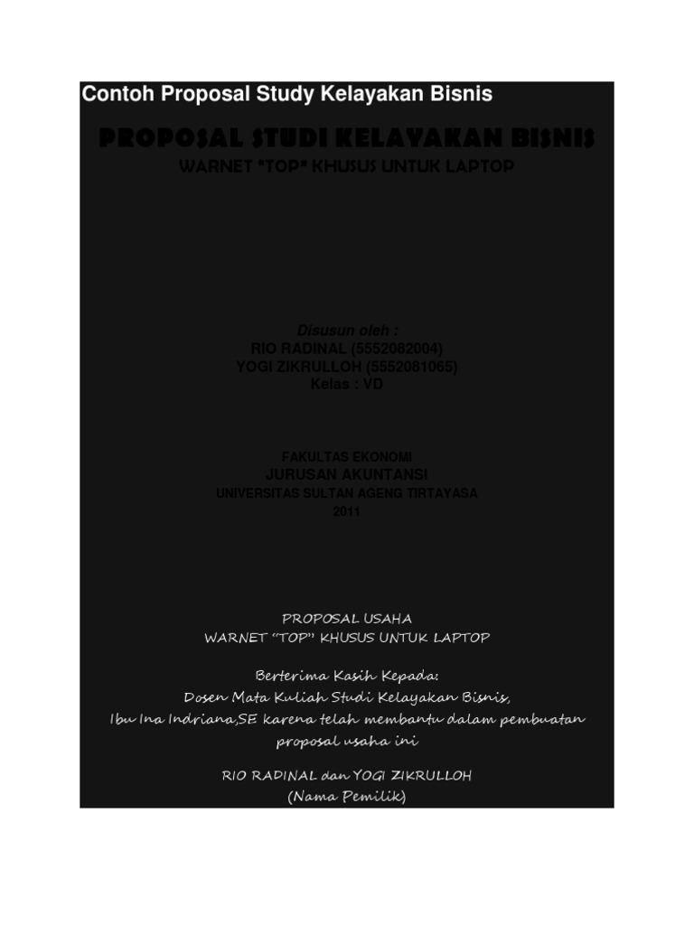 TUGAS AKHIR PROPOSAL STUDDI KELAYAKAN B ISNIS PROPOSAL ... from reader022.dokumen.tips Savesave contoh proposal study kelayakan bisnis for later. Proposal ini disusun untuk memenuhi tugas mata kuliah. Jurusan akuntansi keuangan sekolah tinggi ilmu ekonomi cilegon 2012. Ihsan amrullah nim 200903114 2. Kelayakan bisnis adalah penelahan atau husnan dkk, 2000. Mata kuliah studi kelayakan bisnis. Jika ide bisnis tidak layak atau rencana bisnis tidak dapat dilaksanakan maka kembalikan proposal bisnis dalam ide bisnis yang mungkin ditunda atau ditolak. Hal itu dapat dilihat dengan perkembangan pusat bisnis dan perkantoran di pusat kota lamongan.