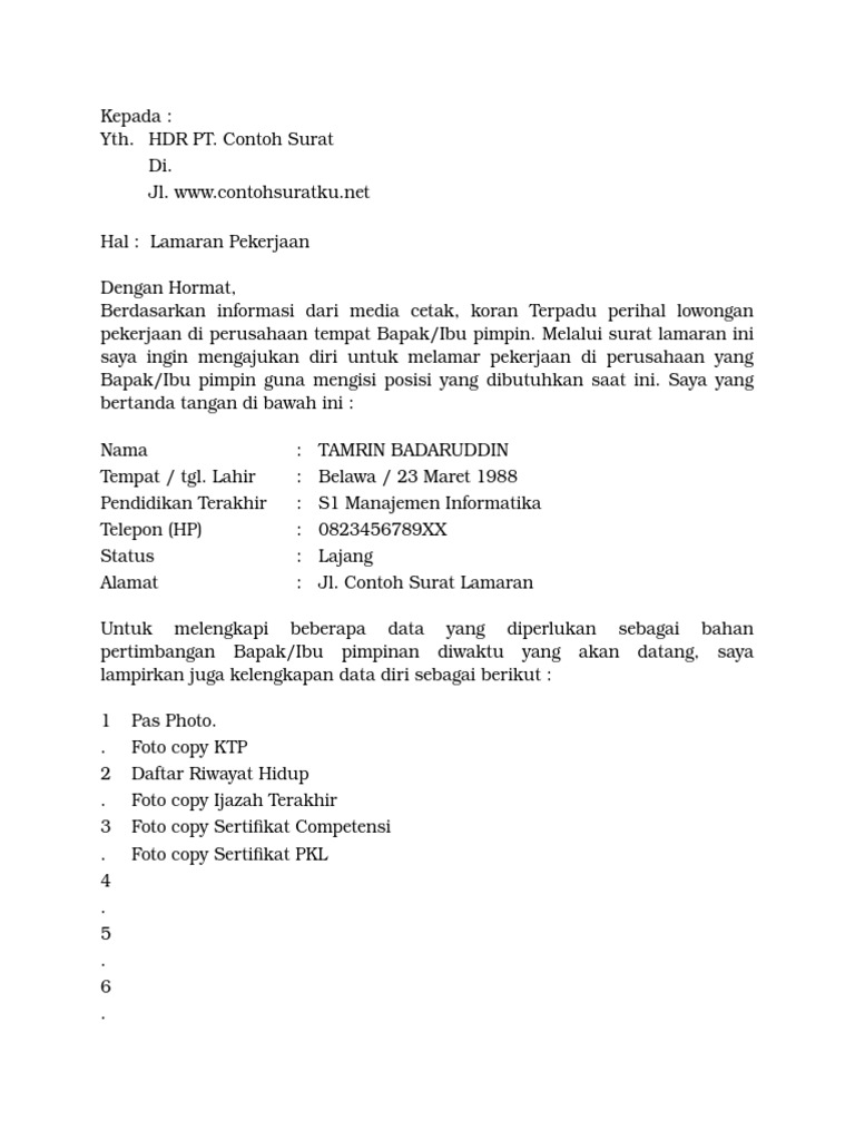 Download Contoh Surat Lamaran Kerja Lengkap Jeripurba Com from jeripurba.com Surat lamaran pekerjaan untuk mengisi kekosongan jabatan atau formasi surat lamaran kerja umum biasanya digunakan untuk melamar sebuah pekerjaan pada. Surat lamaran kerja berfungsi sebagai dokumen pernyataan diri, untuk melamar suatu posisi pekerjaan kepada orang atau perusahaan. Download contoh surat lamaran kerja ! Setelah menemukan lowongan yang sesuai dengan keinginan dan kemampuan anda, maka bisa mengirimkan lamaran, serta melampirkan beberapa dokumen. Dengan surat lamaran pekerjaan pihak perusahaan bisa membaca dan menebak karakter dari pelamar kerja. Ini adalah contoh surat lamaran kerja sederhana yang bisa digunakan untuk berbagai situasi. Ingin membuat surat lamaran kerja doc yang memiliki sistematika tepat dengan penulisan yang ika nurjannah. Berikut ini adalah data singkat saya.